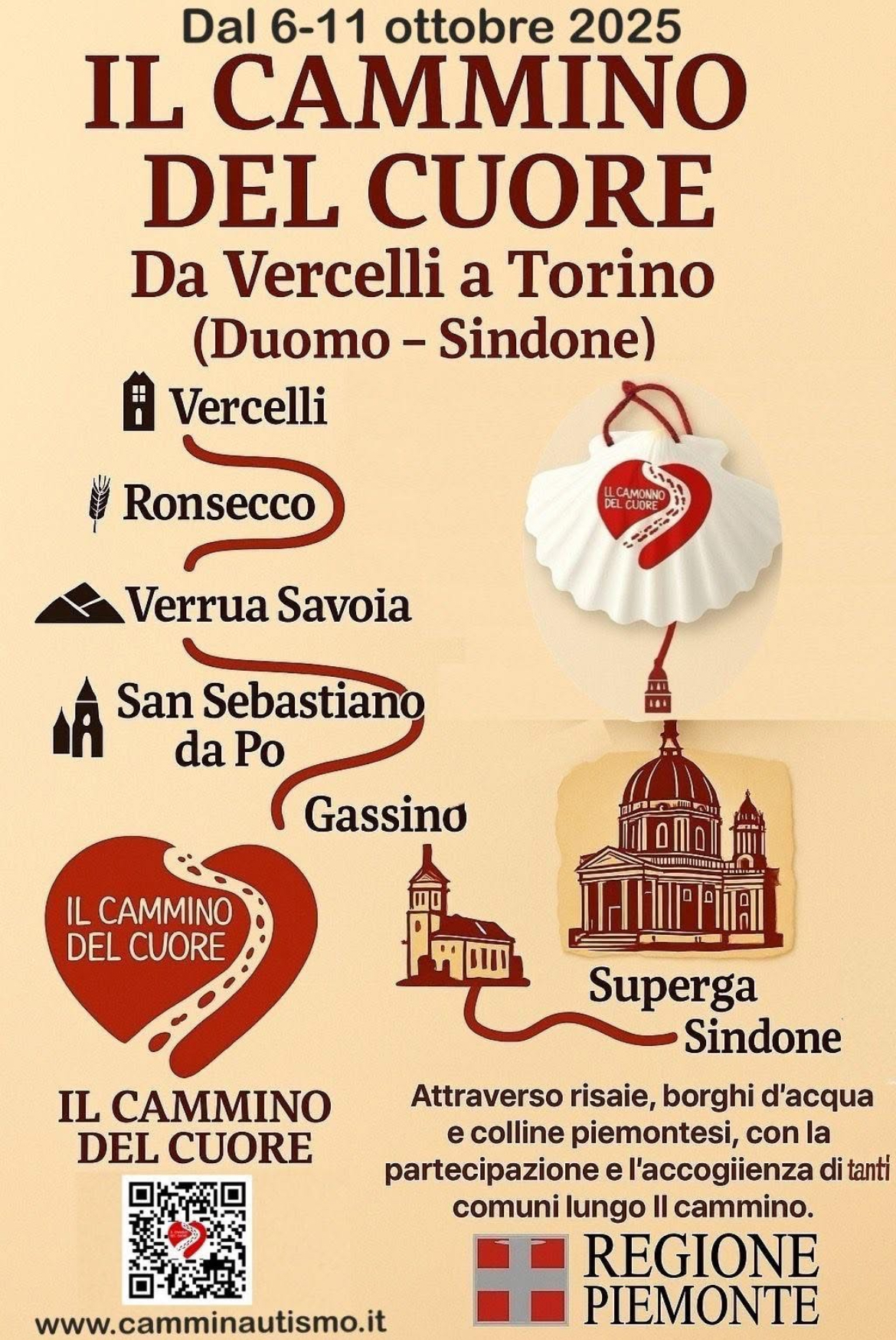 Il Cammino del Cuore è arrivato oggi, giovedì 9 ottobre 2025, a Gassino Torinese, quarta tappa del percorso partito lunedì da Vercelli e diretto a Torino. I pellegrini, impegnati in un itinerario di oltre 120 chilometri tra risaie, borghi e colline piemontesi, hanno raggiunto nel pomeriggio il centro storico gassinese dopo aver percorso 18 chilometri da San Sebastiano da Po, attraversando Castagneto Po e i sentieri che costeggiano il fiume.