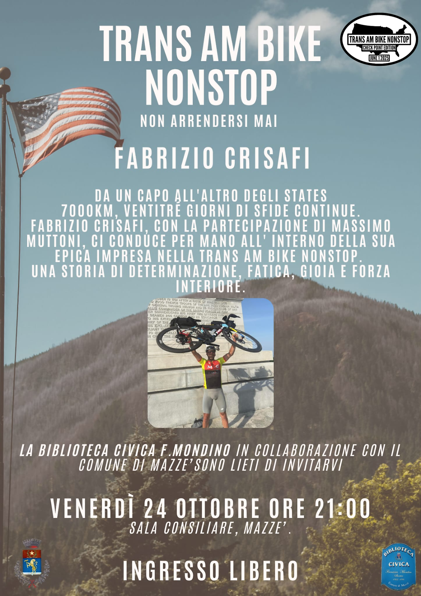 La rassegna proseguirà venerdì 24 ottobre, sempre nella stessa sede, con una serata dedicata a Fabrizio Crisafi, vincitore della Trans Am Bike Nonstop, la celebre corsa di ultracycling che attraversa gli Stati Uniti da costa a costa. L’appuntamento con Crisafi sarà l’occasione per ascoltare la testimonianza diretta di un atleta che ha affrontato una delle prove di resistenza più dure al mondo, portando con sé l’esperienza e la determinazione di chi ha trasformato la fatica in una sfida personale e sportiva.