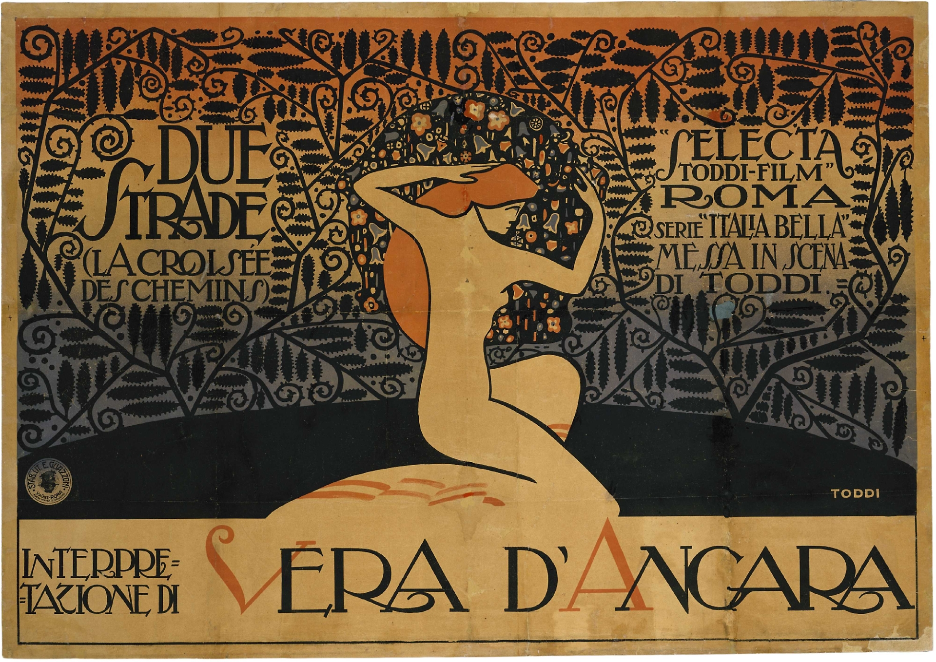 Il percorso espositivo parte dalle esplosioni di colore futuriste di Filiberto Scarpelli e Enrico Prampolini, autori dei manifesti per Il sogno di Don Chisciotte e Thaïs — quest’ultimo considerato l’unico film futurista italiano sopravvissuto — per poi attraversare gli anni Venti con la raffinatezza grafica di Toddi e Vera D’Angara, coppia di artisti tra le più originali del Novecento.