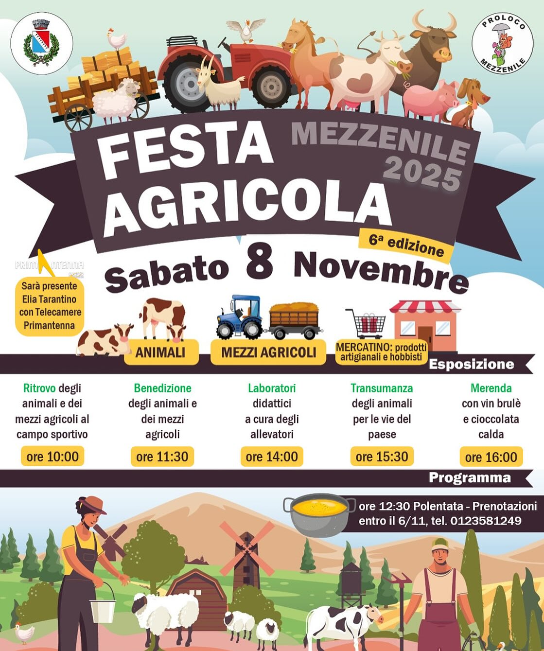 Uno dei momenti più attesi e sentiti della manifestazione sarà la giornata di sabato 8 novembre, quando prenderà vita la sesta edizione della Festa Agricola di San Martino. Dalle prime ore del mattino, il campo sportivo e le aree circostanti si animeranno con l’esposizione di animali e mezzi agricoli, mentre in piazza della Chiesa ci sarà il mercatino di artigianato e hobbistica. Il ritrovo degli animali e dei mezzi agricoli è fissato per le ore 10.00, seguito alle 11.30 dalla benedizione. Alle 12.30 tutti a tavola con la tradizionale polentata al Palasanrocco. Per partecipare è necessario prenotare entro giovedì 6 novembre contattando la Merceria di Vighetti Valeria al numero 0123-581249. Nel pomeriggio, a partire dalle ore 14.00, gli allevatori locali coinvolgeranno grandi e piccoli con laboratori didattici, mentre alle 15.30 la transumanza porterà gli animali a sfilare per le vie del paese. A conclusione della giornata, alle 16.00, merenda con vin brulè e cioccolata calda per tutti. Durante tutta la giornata, la Festa Agricola sarà seguita dalle telecamere di Prima Antenna, con la partecipazione della conduttrice Elia Tarantino.