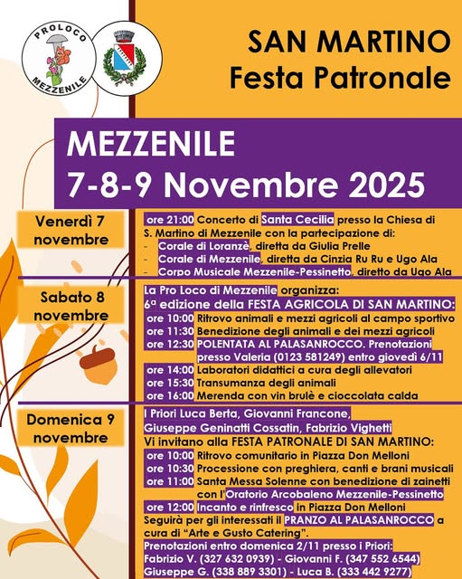 La giornata conclusiva di domenica 9 novembre sarà dedicata alla spiritualità e alla comunità. Il ritrovo è previsto alle ore 10.00 in Piazza Don Melloni. Da qui, alle 10.30, partirà la processione con preghiere, canti e brani musicali. Alle 11.00, nella chiesa parrocchiale di San Martino, si terrà la messa solenne in onore del Santo Patrono, alla presenza dei priori Luca Berta, Giovanni Francone, Giuseppe Geninatti Cossatin e Fabrizio Vighetti. Durante la celebrazione è prevista anche la benedizione degli zainetti, con la partecipazione dell’Oratorio Arcobaleno Mezzenile-Pessinetto. Al termine della celebrazione religiosa, circa alle 12.00, sempre in Piazza Don Melloni, si terranno l’incanto e il rinfresco, tradizionali momenti di socialità che anticipano la conclusione della festa. Il gran finale sarà al Palasanrocco con il pranzo curato da “Arte e Gusto Catering”. Le prenotazioni per il pranzo sono aperte fino a domenica 2 novembre, contattando direttamente i priori: Fabrizio 327 6320939, Giovanni 347 5526544, Giuseppe 338 8893301 o Luca 333 4429277.