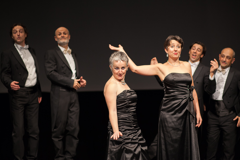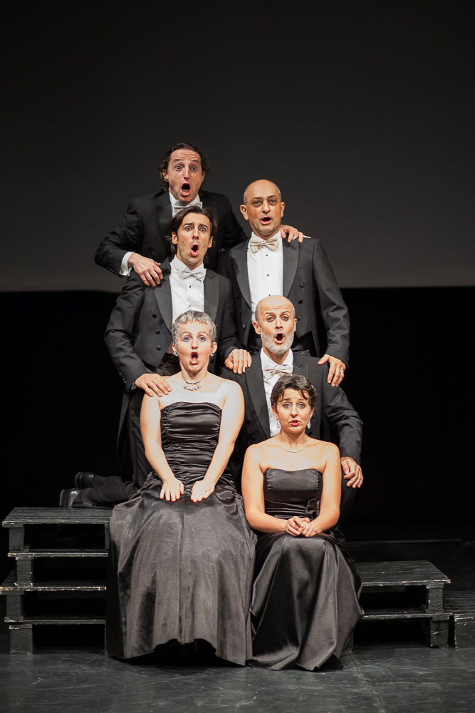 Sul palco sei canta-attori – Marco Andorno, Lucia Giordano, Paola Bordignon, Francesco Micca, Sebastiano Amadio e Lodovico Bordignon – diretti musicalmente da Antonella Talamonti con il contributo creativo di Paolo Nani, artista danese di fama internazionale. Gli interpreti, in eleganti abiti da gran soirée, costruiscono una performance che vive tra canto e gesto, tra coralità e intimità, tra nostalgia e ironia.