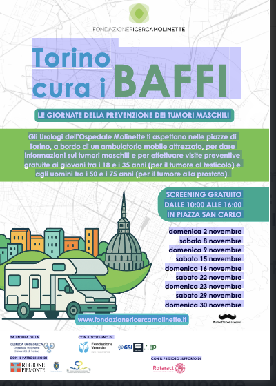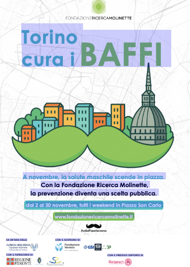 A novembre, Torino si farà crescere i baffi per la ricerca. Torna infatti “Un baffo per la Ricerca – Le giornate della prevenzione”, l’iniziativa promossa dalla Fondazione Ricerca Molinette che ogni anno trasforma Piazza San Carlo in un grande ambulatorio a cielo aperto dedicato alla salute maschile. Dal 2 al 30 novembre, tutti i sabati e le domeniche, un camper della prevenzione attrezzato con ambulatori mobili ospiterà gli urologi dell’Ospedale Molinette, impegnati in visite gratuite e attività di sensibilizzazione per i cittadini.