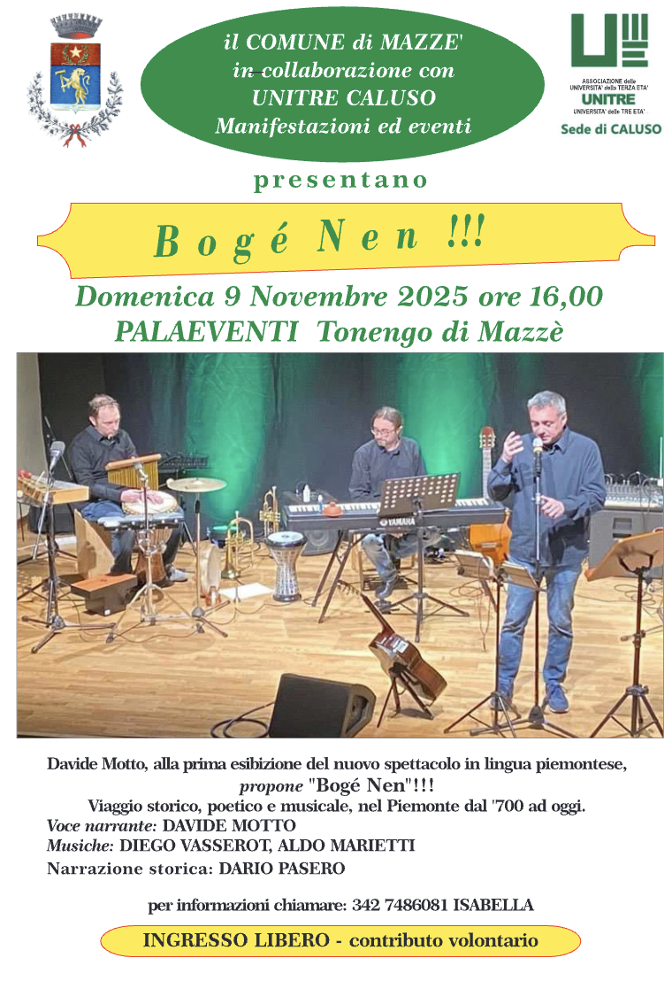 Un viaggio nella memoria collettiva del Piemonte, raccontato con il linguaggio vivo della musica, della poesia e della parola. È questo lo spirito di “Bog é nen”, lo spettacolo ideato e interpretato da Davide Motto, Dario Pasero, Diego Vasserot e Aldo Marietti, che debutterà domenica 9 novembre alle ore 16 al PalaEventi di Tonengo di Mazzè nella sua prima rappresentazione assoluta.