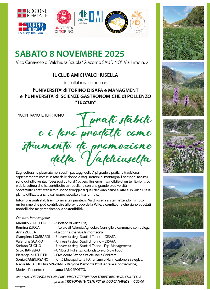 Un paesaggio che non è solo natura, ma anche cultura, lavoro e identità. È da questa consapevolezza che partirà la riflessione al centro del convegno “I prati stabili e i loro prodotti come strumento di promozione della Valchiusella”, in programma sabato 8 novembre a Vico Canavese, frazione di Valchiusa. L’iniziativa è promossa dal Club Amici di Valchiusella con la collaborazione del Dipartimento di Scienze Agrarie, Forestali e Alimentari (DISAFA) e del Dipartimento di Management dell’Università di Torino, insieme all’Università di Scienze Gastronomiche di Pollenzo.