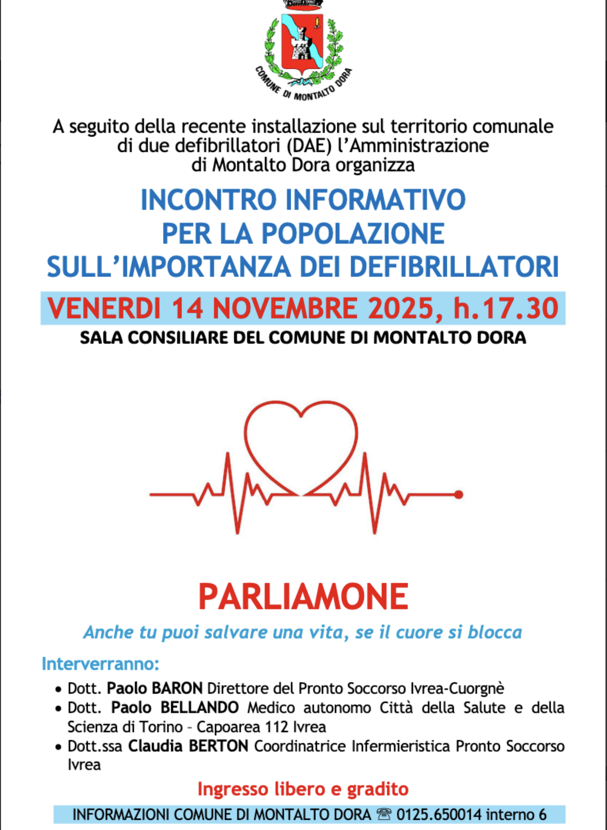 A Montalto Dora si parlerà di vita, di cuore e di pronto intervento. Il Comune, su iniziativa dell’assessora alle Politiche sociali Caterina Megna e con il supporto dell’Ufficio Servizi alla Persona, organizza per venerdì 14 novembre alle 17.30, nella Sala Consiliare, un incontro informativo dedicato all’importanza dei defibrillatori e alla costruzione di una cittadina cardio-protetta.