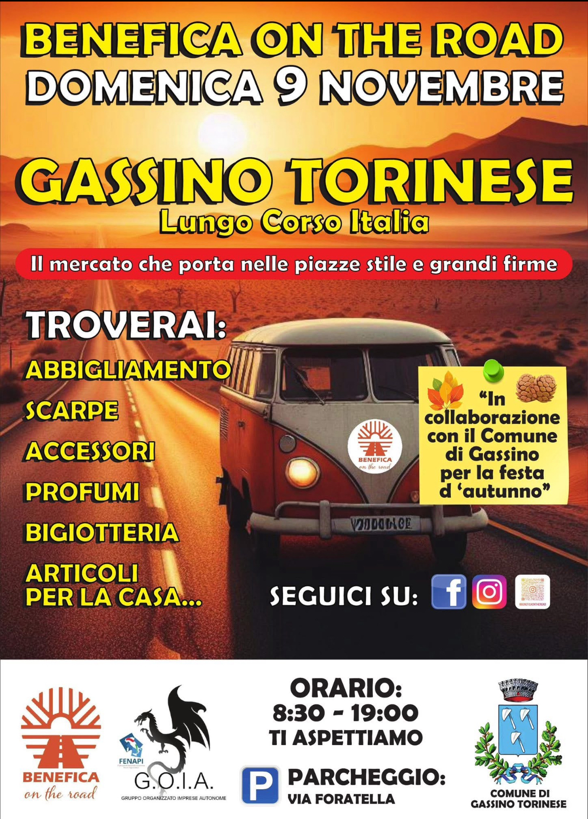 Domenica 9 novembre, Gassino Torinese si prepara a una giornata di festa che abbraccia tutta la città. Dalle 8:30 alle 19:00, corso Italia sarà chiuso al traffico e trasformato in un lungo percorso tra mercato, animazione e shopping, in un clima di partecipazione e allegria.