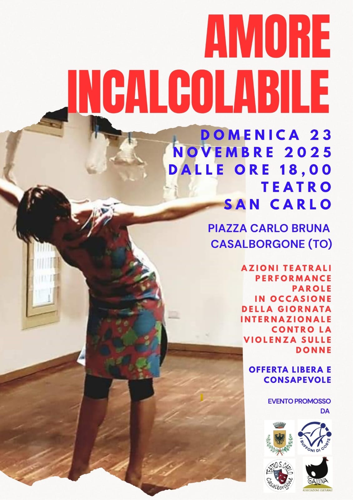 A Casalborgone, domenica 23 novembre, il Teatro San Carlo si trasformerà in un palcoscenico di denuncia e rinascita. L’associazione La Gallina, con il patrocinio del Comune, porta in scena “Amore in(calco)labile” di Paola Colonna, uno spettacolo di arti performative per ricordare, gridare e trasformare la violenza contro le donne in gesto artistico e consapevolezza collettiva.