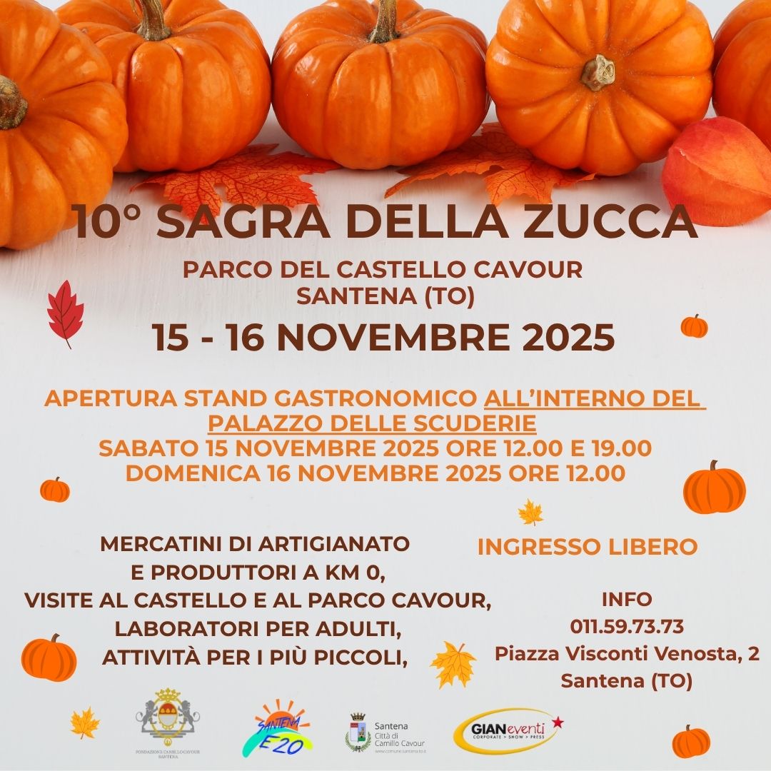 Il profumo della zucca torna a riempire l’aria di Santena per un fine settimana di festa e tradizione. Sabato 15 e domenica 16 novembre 2025, il Parco del Castello Cavour ospita la decima edizione della Sagra della Zucca, un appuntamento che negli anni è diventato simbolo di convivialità, cultura e riscoperta dei prodotti del territorio.