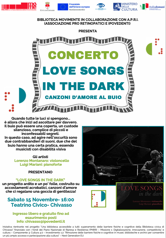 Quando le luci si spengono, resta solo l’ascolto. E in quell’oscurità che diventa rifugio e rivelazione, prende vita “Love Songs in the Dark – Canzoni d’amore al buio”, il concerto che sabato 15 novembre alle 16, al Teatrino Civico di Chivasso, chiuderà ufficialmente il progetto “Una biblioteca accessibile a tutti: superamento delle barriere fisiche e cognitive della Biblioteca civica”, finanziato con i fondi del Piano Nazionale di Ripresa e Resilienza.
