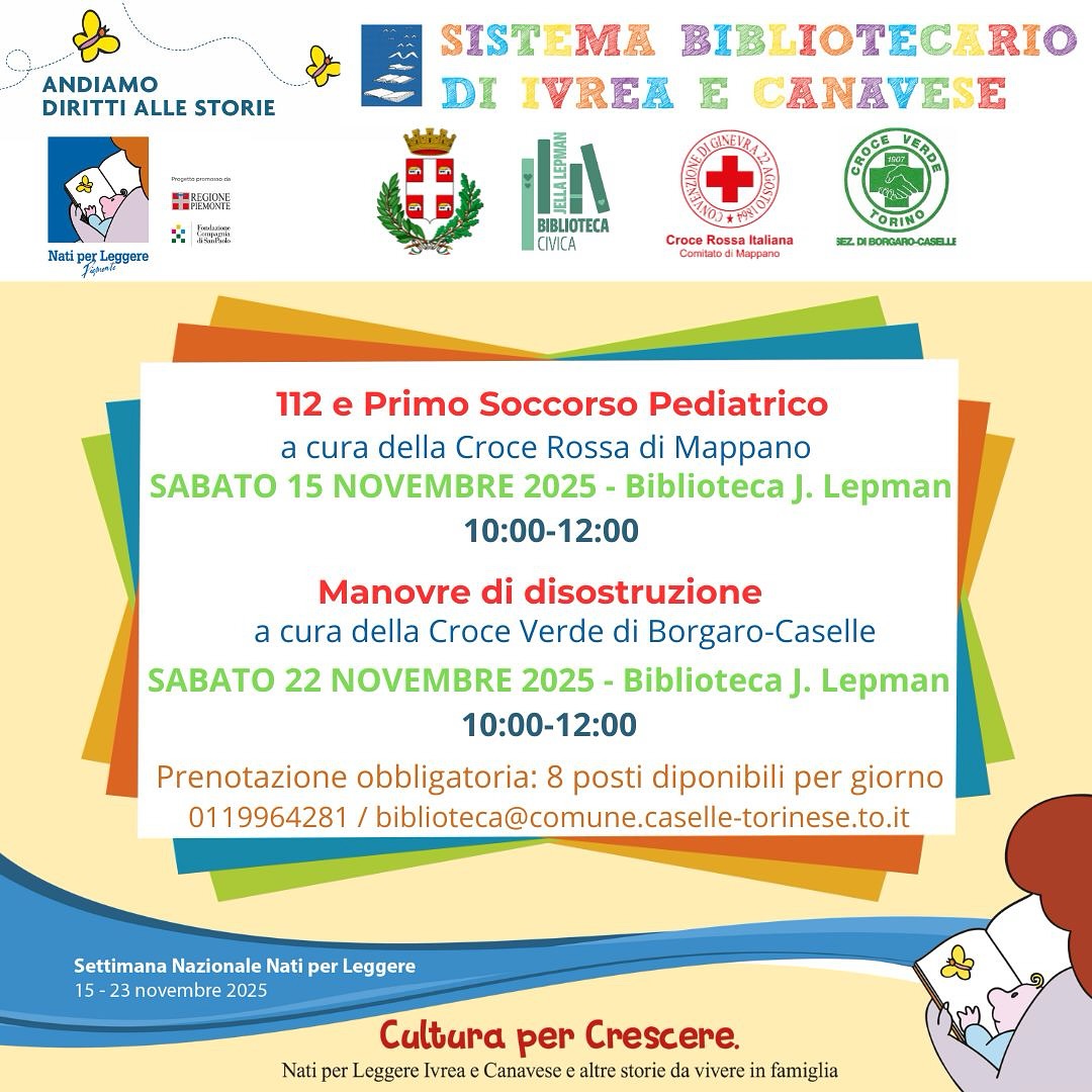 In occasione della XXVI Settimana Nazionale Nati per Leggere, la Biblioteca Jella Lepman di Caselle Torinese propone un’iniziativa di grande importanza: un corso gratuito di Primo Soccorso Pediatrico, realizzato in collaborazione con la Croce Rossa di Mappano e la Croce Verde di Borgaro-Caselle.