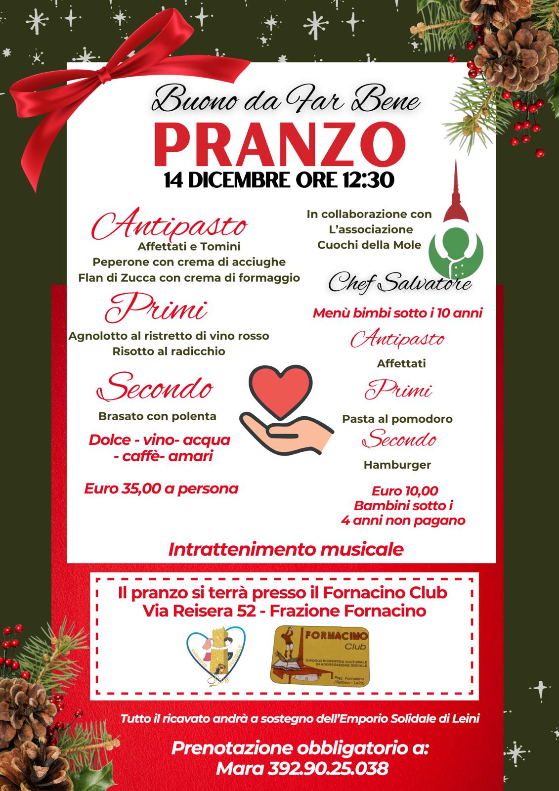 Il Pranzo Solidale a sostegno dell’Emporio Solidale, promosso dalla vicepresidente Lucia Bersani e dall’organizzatrice Mara Caiella, si terrà sabato 14 dicembre 2024 alle ore 12.30 nella nuova e accogliente cornice del Fornacino Club, via Reisera 52 - Frazione Fornacino, che ha scelto di sostenere con entusiasmo l’iniziativa e di aprire le proprie porte all'evento di solidarietà.