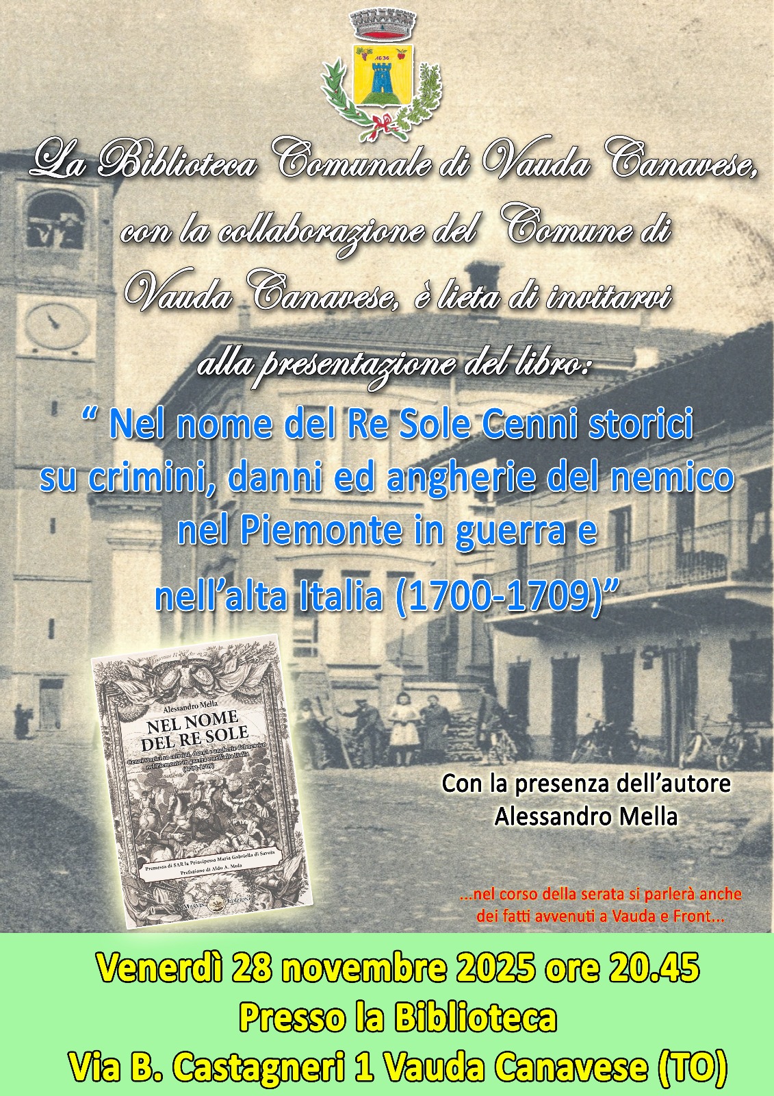 La memoria storica, a volte, non si conserva nei grandi palazzi del potere ma nelle pieghe dimenticate della vita quotidiana. È proprio questo il filo conduttore della serata organizzata dalla Biblioteca di Vauda, con il supporto dell’Amministrazione comunale, per giovedì 28 novembre alle 20.45, nella sede di via Castagneri. Un incontro che non ha nulla di celebrativo o accademico, ma che intende restituire voce a un Piemonte ferito, impoverito e spesso ignorato nei racconti ufficiali: quello che visse gli anni durissimi della guerra del 1700-1709 sotto l’ombra del Re Sole, tra angherie, razzie e violenze che toccarono direttamente anche le comunità di Vauda Canavese e Front.