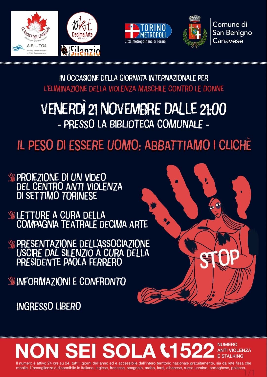 Nel segno di un messaggio chiaro e necessario, “La violenza non è mai amore”, il Comune di San Benigno Canavese, con il patrocinio della Città Metropolitana di Torino, organizza per venerdì 21 novembre alle ore 21 una serata dedicata alla Giornata internazionale contro la violenza sulle donne. Un appuntamento aperto alla cittadinanza, ospitato negli spazi della Biblioteca Comunale, per riflettere, ascoltare testimonianze e approfondire un tema che, purtroppo, resta drammaticamente attuale.