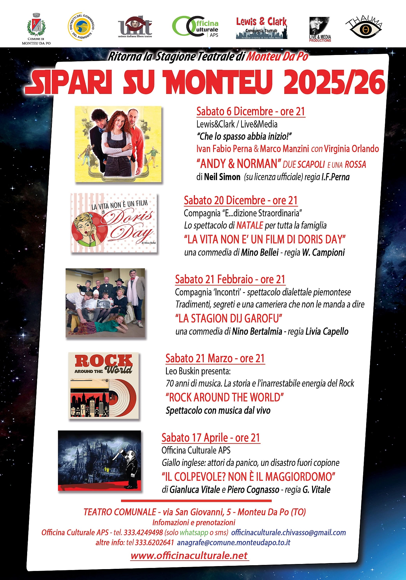 Com’è che si ricomincia a Monteu da Po? Con due scapoli, una rossa e una manciata di caos sentimentale firmato Neil Simon. Altro che inaugurazione solenne: il Teatro Comunale sceglie il sorriso – quello intelligente, ritmato, un po’ velenoso – per aprire la stagione “Sipari su Monteu 2025/26”, e lo fa sabato 6 dicembre, alle 21, con “Andy & Norman”, portato in scena dalla compagnia Lewis&Clark sotto la regia di Ivan Fabio Perna, che della commedia americana conosce ogni ingranaggio e ogni trabocchetto.