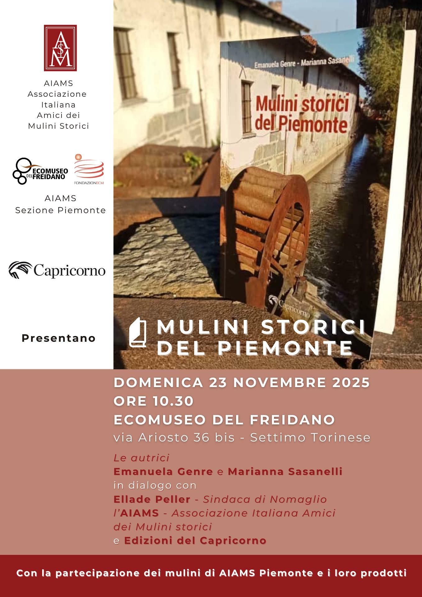 Domenica 23 novembre 2025, alle 10.30, l’Ecomuseo del Freidano di Settimo Torinese – sede regionale per il Piemonte di AIAMS – apre le porte alla presentazione di un volume che promette di cambiare il modo in cui guardiamo ai luoghi più silenziosi e dimenticati della regione: “Mulini storici del Piemonte”, firmato da Emanuela Genre e Marianna Sasanelli per Edizioni del Capricorno. Un libro che non si limita a raccontare architetture, ma che ricostruisce un pezzo di identità culturale attraverso i mulini, edifici spesso trascurati eppure decisivi nella storia economica e sociale delle comunità piemontesi.