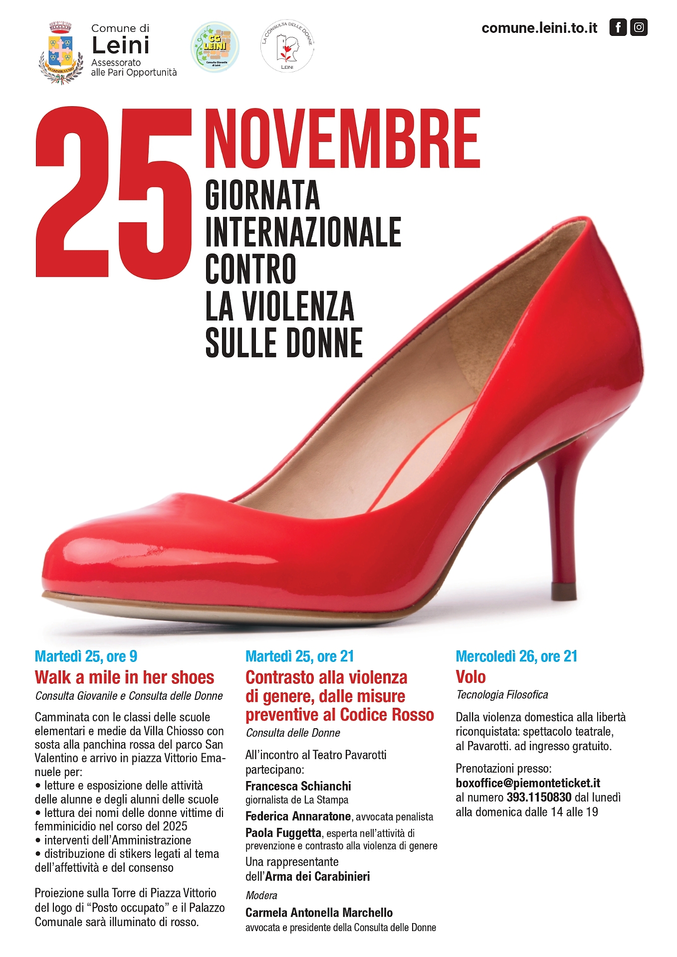 Tre iniziative, un unico messaggio: la violenza sulle donne riguarda tutti, e combatterla è un impegno che una comunità può e deve condividere. Così Leini si prepara a celebrare il 25 novembre, Giornata internazionale per l’eliminazione della violenza contro le donne, con un programma fitto promosso dagli assessorati alle Pari Opportunità e alla Cultura, dalla Consulta Giovanile e dalla Consulta delle Donne, in collaborazione con le scuole del territorio.