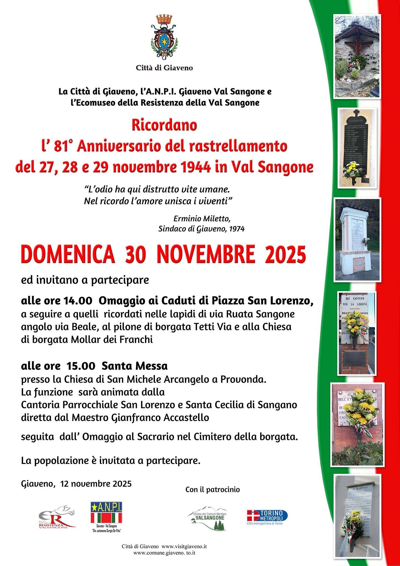 Alle 15, nella chiesa di San Michele Arcangelo in borgata Provonda, sarà celebrata la Messa in suffragio dei caduti, animata dalle Cantorie di San Lorenzo e Santa Cecilia di Sangano, dirette dal maestro Gianfranco Accastello. A seguire, l’omaggio al sacrario del cimitero di Provonda, dove riposano molte delle vittime di quel rastrellamento.
