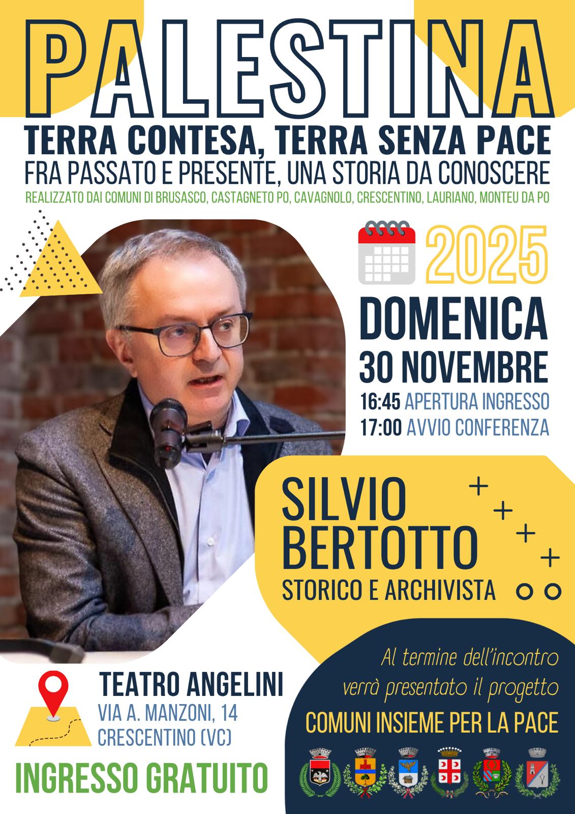 A Crescentino si parlerà di Palestina senza gridare, senza curve da stadio, senza quella semplificazione brutale che ormai domina ogni dibattito pubblico. Domenica 30 novembre, alle 17, il Teatro Angelini ospiterà la lectio magistralis dello storico e archivista Silvio Bertotto, intitolata “Palestina: terra contesa, terra senza pace. Fra passato e presente, una storia da conoscere”. Un titolo che è già una presa di posizione: per capire serve conoscere, e per conoscere serve tempo, complessità, memoria.