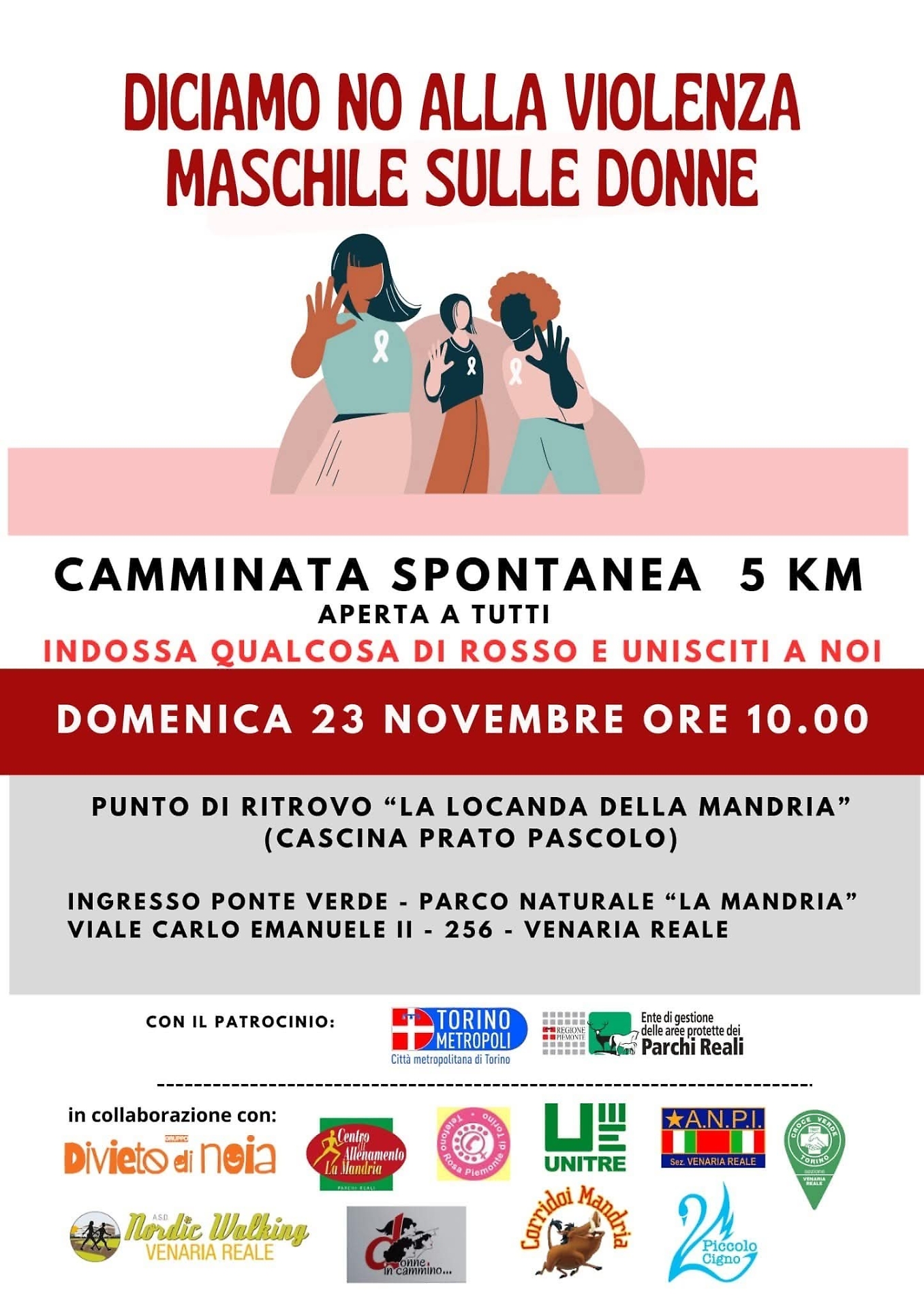 Il messaggio è semplice, diretto, impossibile da ignorare: “Diciamo NO alla violenza maschile sulle donne”. È il titolo dell’iniziativa che domenica 23 novembre, alle 10, porterà nel Parco naturale La Mandria centinaia di persone per una camminata spontanea di 5 chilometri, aperta a tutti, con un invito che è già un simbolo: indossare qualcosa di rosso.