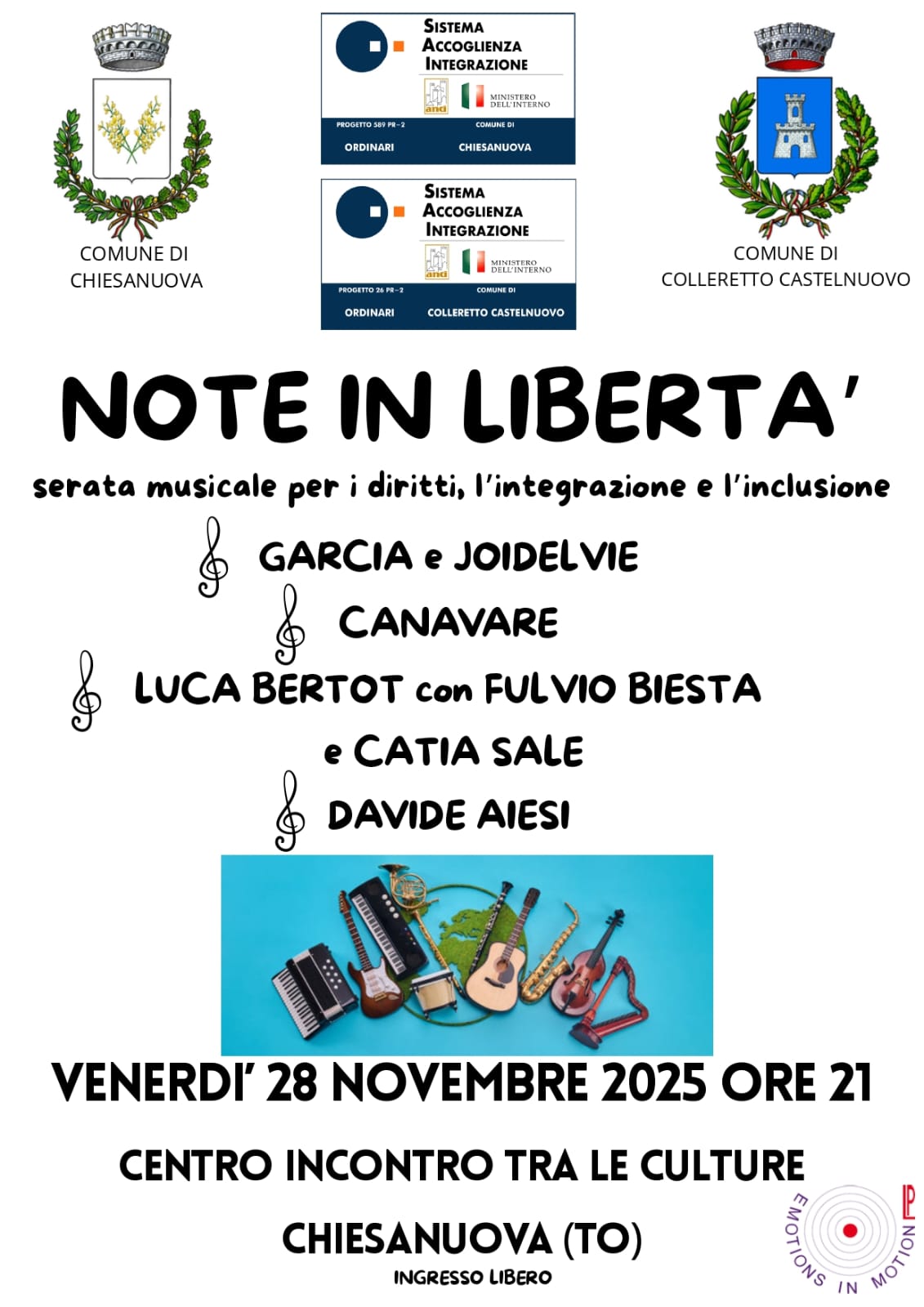 A promuovere l’iniziativa sono i progetti Sai di Chiesanuova e Colleretto Castelnuovo, il sistema pubblico che si occupa dell’accoglienza e dell’integrazione dei richiedenti asilo e dei rifugiati. Questa volta hanno scelto la musica come linguaggio comune, quello che attraversa le differenze senza chiedere il permesso e che permette di sedersi accanto a qualcuno che non si conosce ancora.