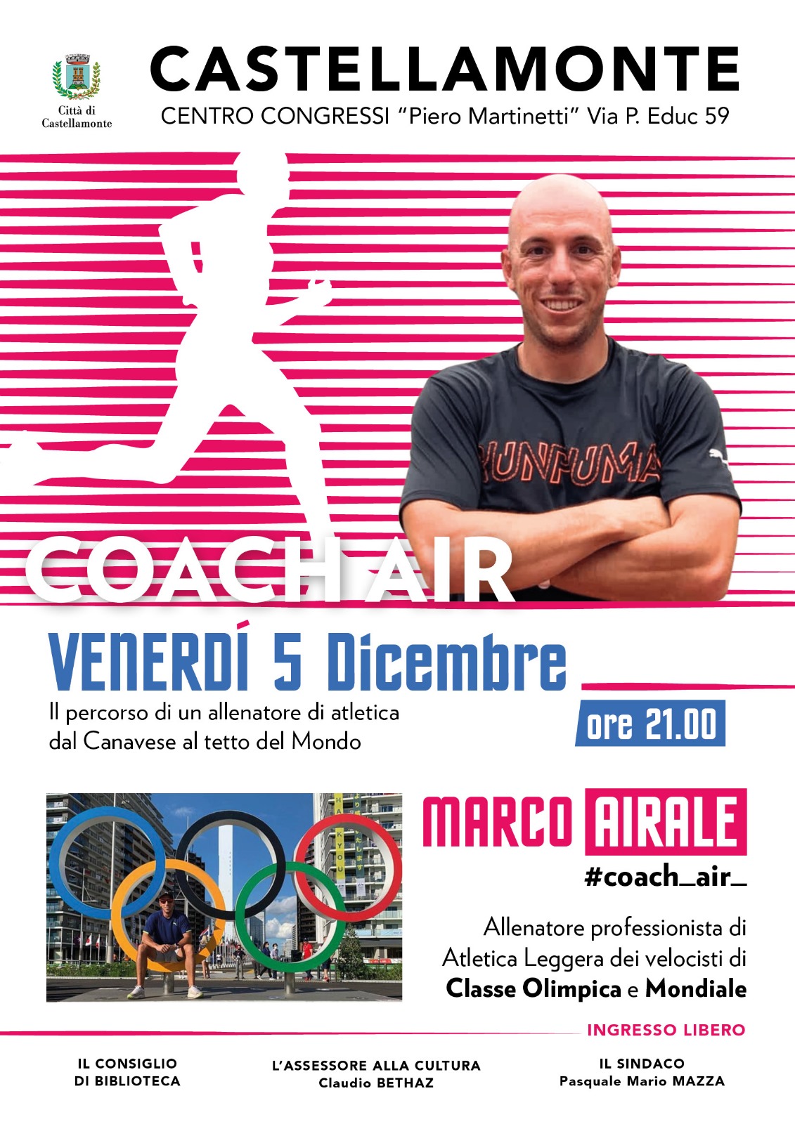 Venerdì 5 dicembre Castellamonte porta sul palco uno dei suoi talenti più clamorosi, e lo fa senza cerimonie inutili: alle 21, al Centro Congressi Piero Martinetti, arriva Marco Airale, il coach canavesano che in questi anni ha portato la sua firma sulle piste più veloci del pianeta. Una conferenza dal titolo eloquente – “Coach Air. Il percorso di un allenatore di atletica dal Canavese al tetto del Mondo” – organizzata dall’Assessorato alla Cultura e dal Consiglio di Biblioteca. Ingresso libero, perché certe storie non dovrebbero avere biglietto.