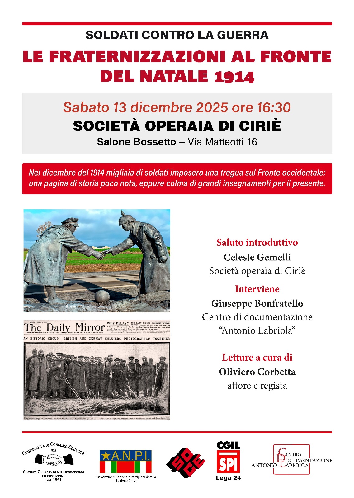 L’iniziativa, promossa dalla Cooperativa di Consumo Ciriaçese – già Società Operaia di Mutuo Soccorso, insieme alla Sezione ANPI di Cirié, allo SPI–CGIL Lega 24 e al Centro di documentazione “Antonio Labriola”, propone una riflessione su un evento che nel dicembre 1914 attraversò il fronte occidentale in più punti, diventando un simbolo della capacità dei popoli di riconoscersi anche dentro la più feroce delle guerre. Migliaia di uomini, spesso giovanissimi, sospesero il conflitto nonostante gli alti comandi avessero vietato qualsiasi contatto con il nemico. Una scelta collettiva che la storiografia ha ricostruito negli anni grazie a testimonianze, fotografie e articoli pubblicati dalla stampa britannica e tedesca, come quelli del Daily Mirror, alcune delle cui immagini sono riportate anche nella locandina dell’evento.