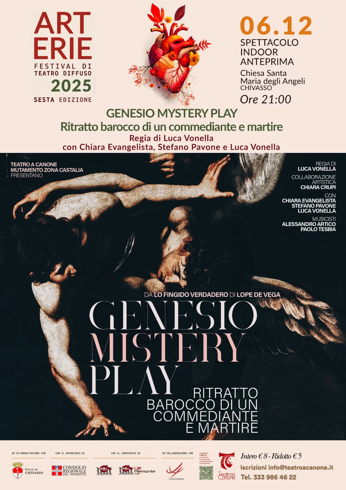 Sabato 6 dicembre 2025, alle ore 21:00, la suggestiva Chiesa Santa Maria degli Angeli a Chivasso sarà la cornice per il debutto nazionale di “GENESIO MYSTERY PLAY – Ritratto barocco di un commediante e martire”. La nuova produzione di Il Mutamento Zona Castalia ETS/ Teatro a Canone , con la regia di Luca Vonella e la collaborazione artistica di Chiara Crupi, promette di essere un evento di forte impatto emotivo e drammaturgico, mescolando teatro popolare, musica e tableaux caravaggeschi.
