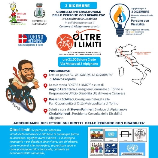 Promuovere i diritti delle persone con disabilità significa farlo ogni giorno, ma il 3 dicembre, Giornata Internazionale riconosciuta dalle Nazioni Unite, diventa l’occasione per fermarsi, ascoltare e chiedersi a che punto siamo davvero. Ad Alpignano questa domanda prende forma concreta grazie alla Consulta delle Disabilità, che in collaborazione con il Comune ha organizzato una serata-evento pensata non solo per celebrare la ricorrenza, ma per alimentare una discussione reale, aperta e inclusiva. L’appuntamento è fissato per le 21 all’Opificio Cruto, luogo simbolico che ospiterà l’iniziativa dal titolo “Oltre i limiti – Un viaggio da Torino a Roma per l’inclusione”.