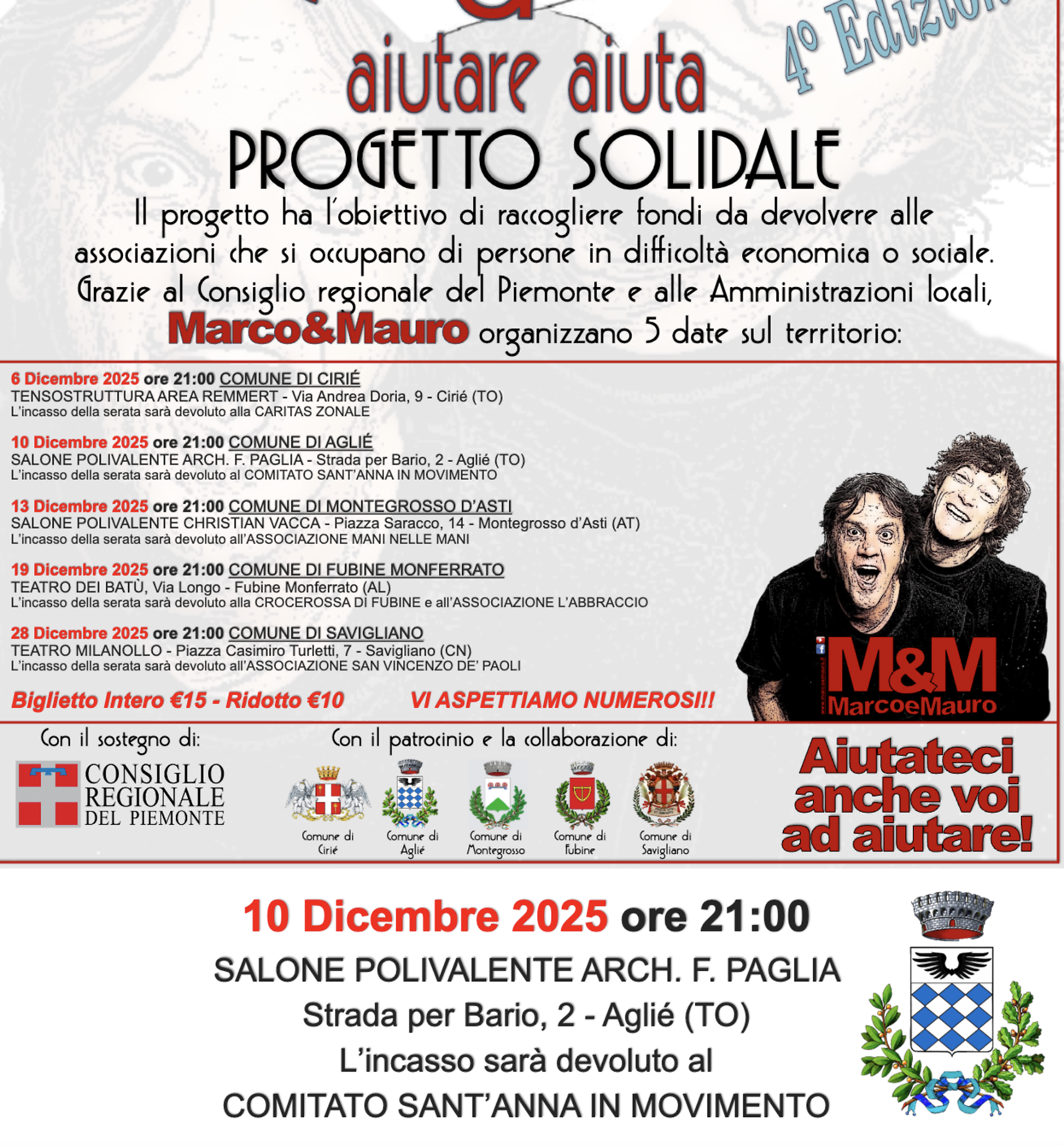 Il cartellone delle iniziative natalizie si arricchisce di un progetto che va oltre lo spettacolo e punta dritto al sostegno concreto delle realtà che assistono chi vive situazioni di fragilità economica o sociale. Il Progetto Solidale, promosso da Marco&Mauro con il supporto del Consiglio regionale del Piemonte e delle amministrazioni locali, mette in fila cinque serate distribuite sul territorio, tra solidarietà, partecipazione e impegno comunitario. Le informazioni emergono chiaramente dalla locandina ufficiale disponibile nel documento allegato .