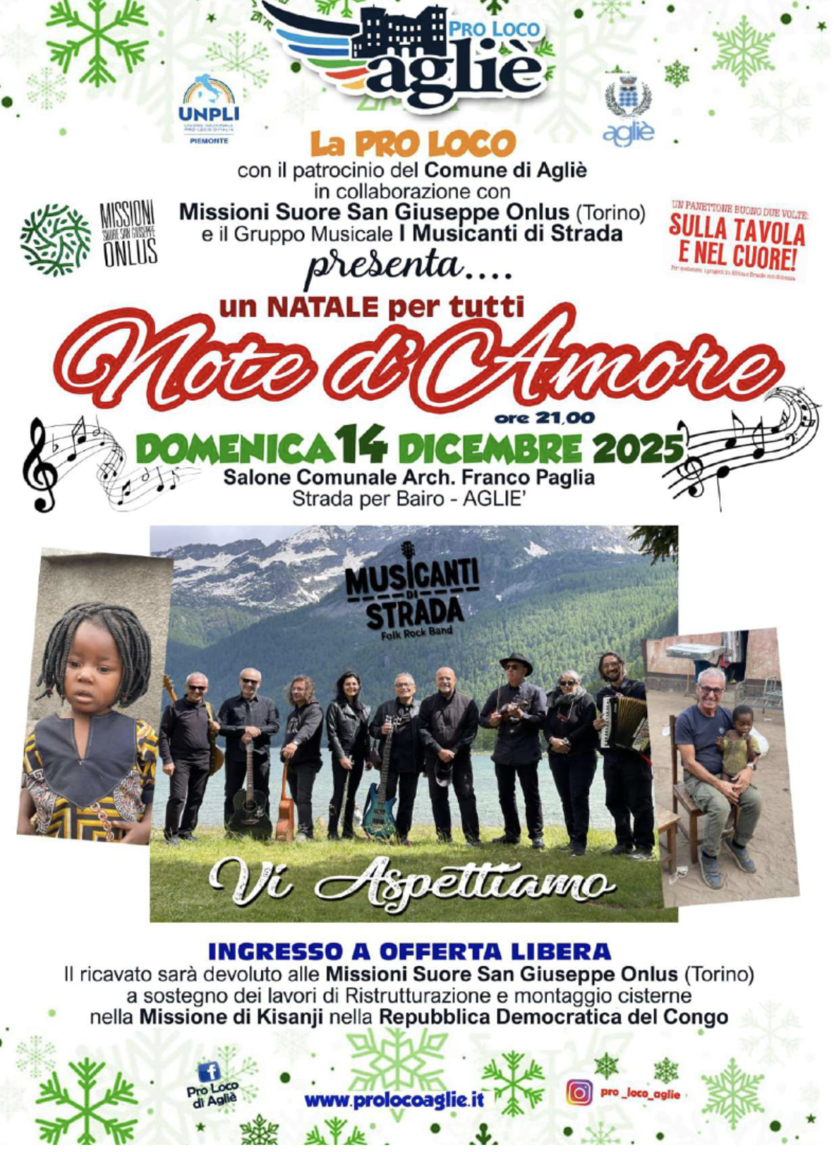 Si parte il 6 dicembre a Cirié, nella tensostruttura dell’Area Remmert in via Andrea Doria 9, dove l’incasso sarà devoluto alla Caritas Zonale. Il progetto si sposta poi ad Agliè, il 10 dicembre, nel Salone Polivalente Arch. F. Paglia, con una serata a sostegno del Comitato Sant’Anna in Movimento, come indicato nella parte centrale della locandina. Il terzo appuntamento sarà il 13 dicembre a Montegrosso d’Asti, nel Salone Polivalente Christian Vacca, con un contributo destinato all’associazione Mani nelle Mani.