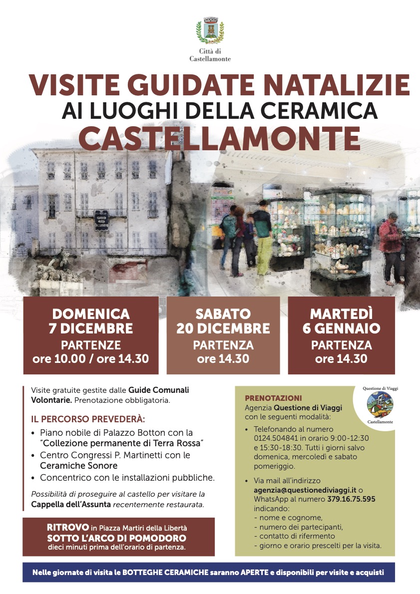 Le visite guidate gratuite alla scoperta delle Ceramiche di Castellamonte saranno effettuate quest’anno anche nel periodo natalizio. Il Comune ha scelto per questa iniziativa le giornate di domenica 7 dicembre, sabato 20 dicembre e martedì 6 gennaio.