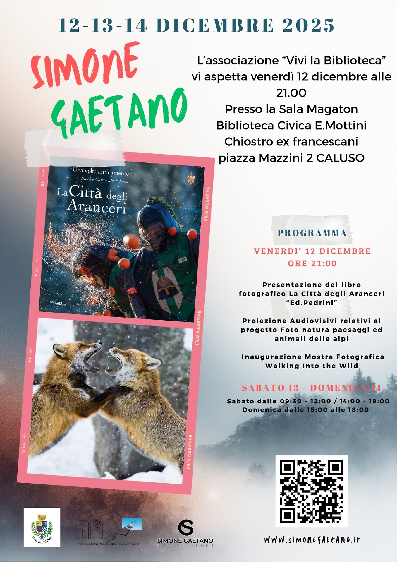 L’appuntamento, sostenuto dal Comune di Caluso e dall’associazione Vivi la Biblioteca, conferma la volontà del territorio di investire su eventi culturali capaci di raccontare l’identità locale con uno sguardo contemporaneo. Gaetano, del resto, è un autore che intreccia tradizione e selvatico, memoria e tensione verso l’altrove: le sue immagini – che siano volpi che si affrontano nella neve o aranceri immersi nel caos – parlano di legami, di riti collettivi e di quanto la fotografia possa ancora restituire verità non filtrate.