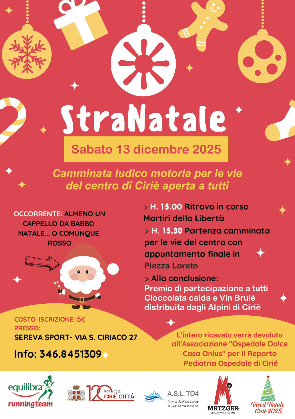 L’iscrizione alla StraNatale costa 5 euro e può essere effettuata presso Sereva Sport, in via S. Ciriaco 27, oppure direttamente prima della partenza. Ogni contributo verrà interamente devoluto all’Associazione Ospedale Dolce Casa Onlus, che da anni lavora a fianco del reparto di Pediatria dell’Ospedale di Cirié per rendere più serena e sostenibile la permanenza dei bambini ricoverati. È un dettaglio che non riguarda solo la beneficenza, ma racconta concretamente il legame tra la manifestazione e la comunità: chi partecipa non contribuisce soltanto a riempire le strade, ma sostiene un progetto che incide in modo diretto sulla vita delle famiglie coinvolte nelle cure pediatriche.