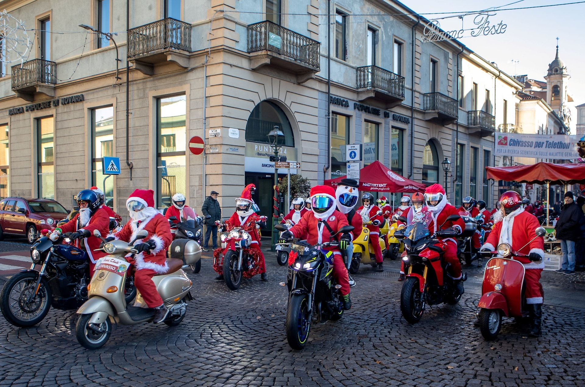 Ore 10,30 – 12,30: nel centro cittadino, passaggio del 23° Raduno Telethon dei Babbo Natale in moto e Vespe (referente Filippo Ambrosini, cell. 338- 9192992), a cura del Vespa Club Chivasso.
