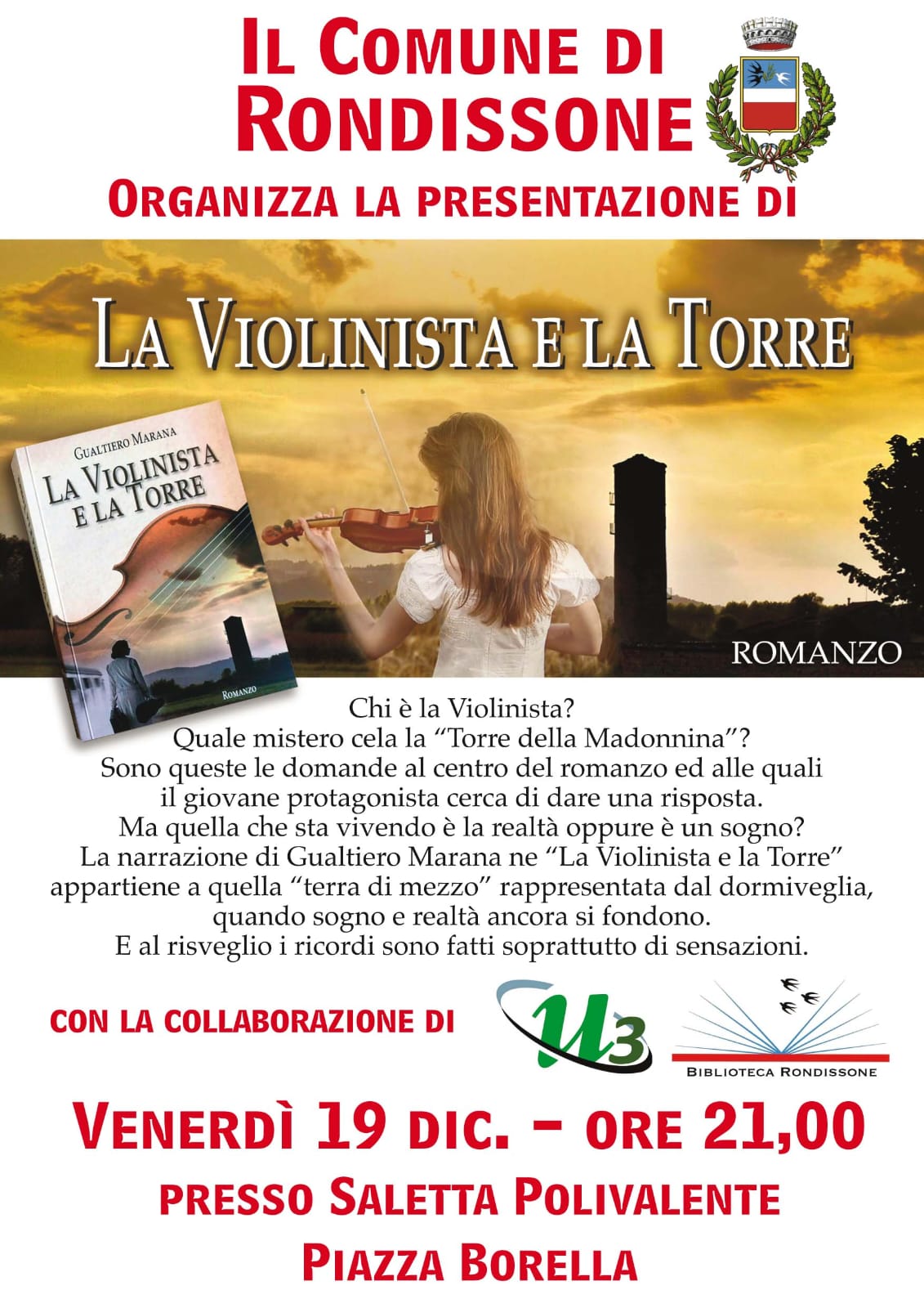 Venerdì 19 dicembre 2025, alle 21, il Comune di Rondissone organizza la presentazione del romanzo “La violinista e la torre” di Gualtiero Marana. L’appuntamento è in saletta polivalente, in piazza Borella, con la collaborazione di U3 e della Biblioteca di Rondissone.