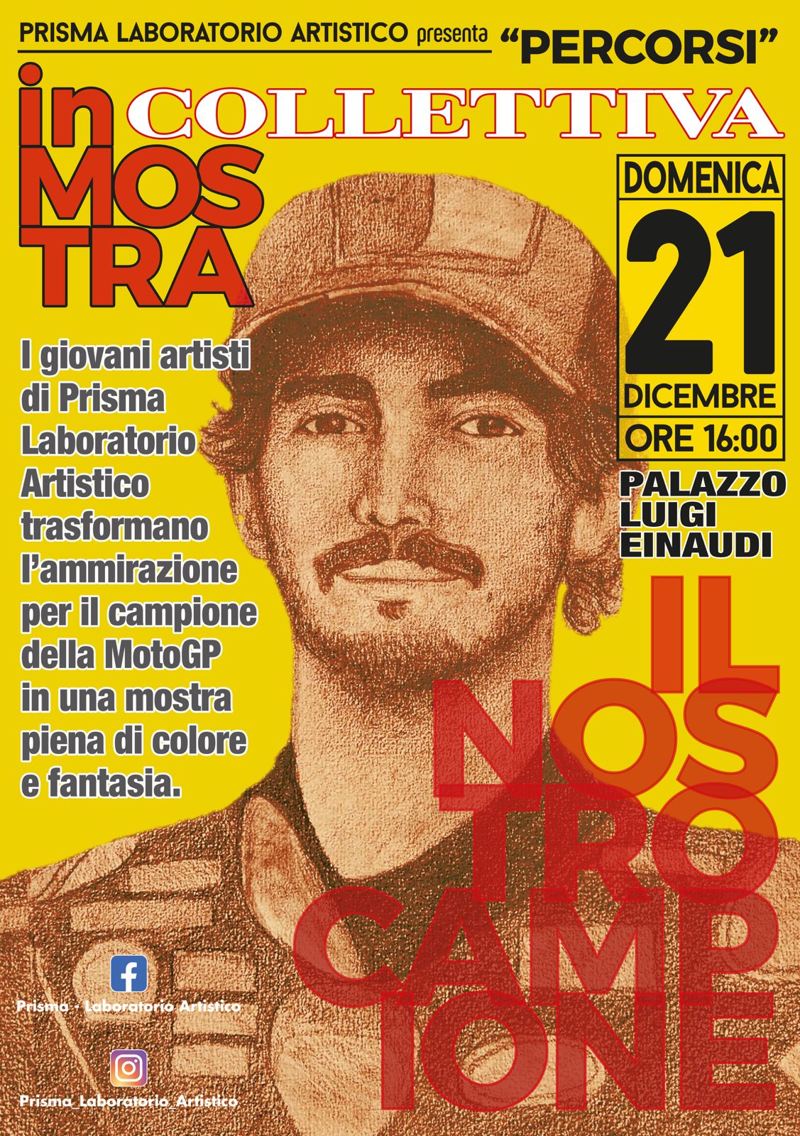Domenica 21 dicembre, a partire dalle ore 16, la Galleria Cosola di Palazzo Einaudi ospiterà i lavori realizzati dai bambini e ragazzi di Prisma Laboratorio Artistico, ispirati a Francesco “Pecco” Bagnaia, il campione che da Chivasso ha conquistato il mondo.