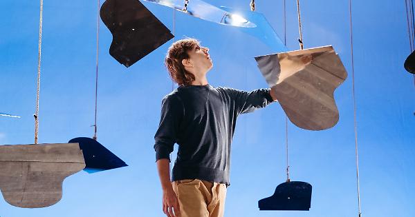 Lorenzo Tombesi in scena, con le sagome d'acciaio a forma di pianoforte realizzate delle Officine Morello (Foto Luigi Di Palma)