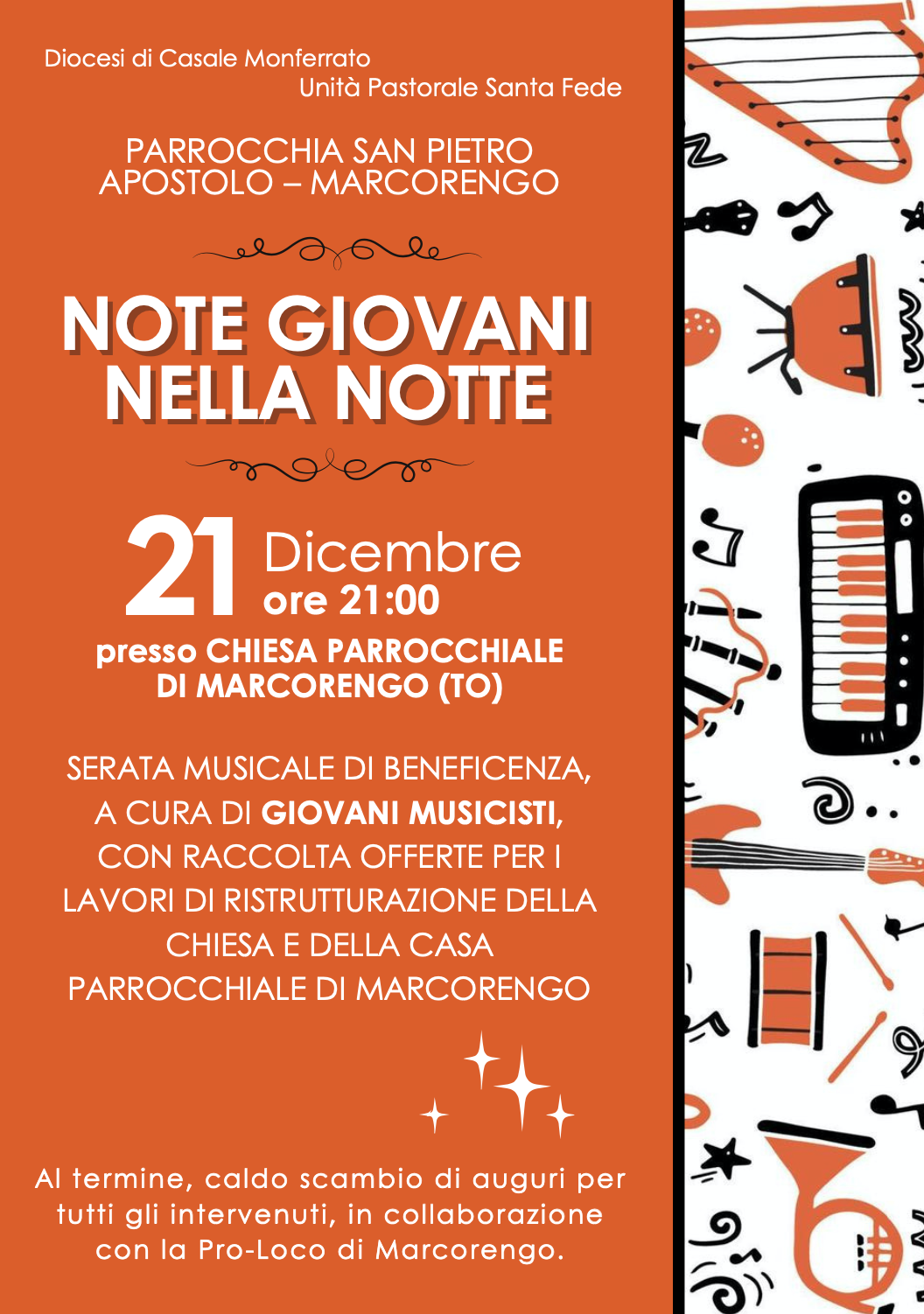 Domenica 21 dicembre 2025, alle 21.00, la Chiesa parrocchiale di Marcorengo aprirà le porte a “Note Giovani nella Notte”, una serata musicale di beneficenza promossa dalla Parrocchia San Pietro Apostolo di Marcorengo, all’interno dell’Unità Pastorale Santa Fede della Diocesi di Casale Monferrato. L’iniziativa porterà sul palco giovani musicisti under 30, alcuni dei quali alla prima esibizione pubblica, chiamati a misurarsi con brani di vario genere musicale, ispirati e non al Natale.