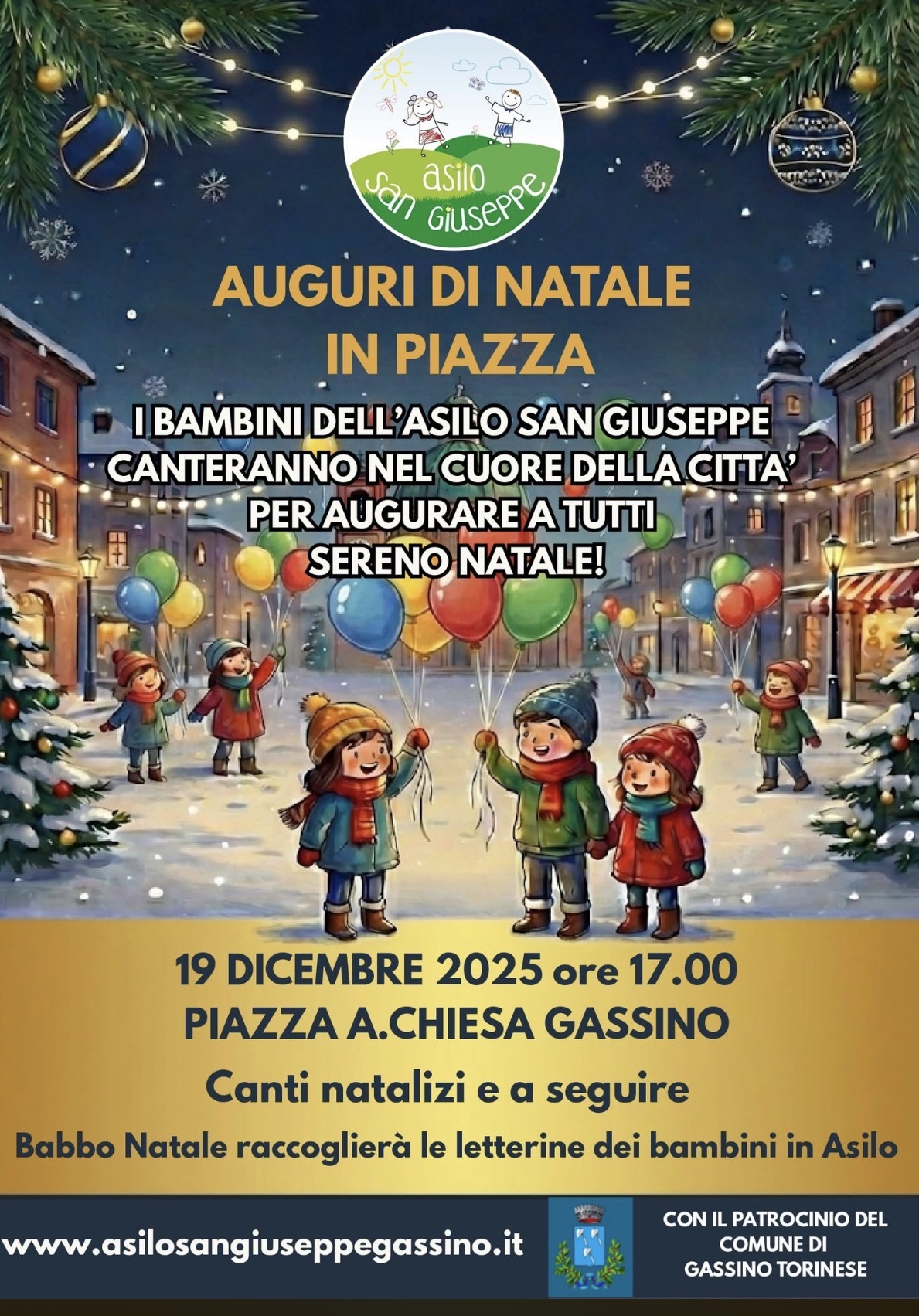 A Gassino il Natale si avvicina. I bambini dell’Asilo San Giuseppe si esibiranno il 19 dicembre, alle 17, in piazza A. Chiesa, dove è previsto un appuntamento pubblico aperto a famiglie e residenti. L’evento rientra nel calendario delle iniziative natalizie della città e ripropone una formula ormai collaudata.