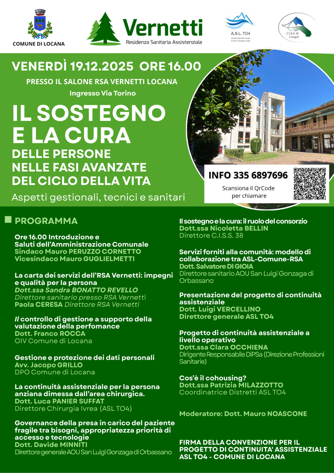 Un pomeriggio di confronto concreto, tecnico ma profondamente umano, dedicato a uno dei temi più delicati della sanità contemporanea: il sostegno e la cura delle persone nelle fasi avanzate del ciclo della vita. È l’obiettivo dell’incontro in programma venerdì 19 dicembre 2025 alle ore 16, presso il salone della RSA Vernetti di Locana, con ingresso da via Torino, promosso dal Comune di Locana in collaborazione con la RSA Vernetti, l’ASL TO4 e il C.I.S.S. 38 Cuorgnè.