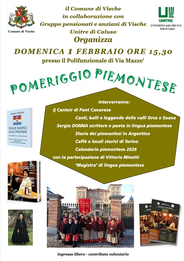 L’iniziativa è organizzata dal Comune di Vische in collaborazione con il Gruppo pensionati e anziani di Vische e con l’Unitre di Caluso, realtà che da anni lavorano per valorizzare il patrimonio culturale locale e favorire momenti di incontro aperti a tutte le età. Non una semplice rassegna folkloristica, ma un’occasione per riflettere su cosa significhi oggi mantenere viva l’identità piemontese, tra tradizione orale, musica, letteratura e storia sociale.
