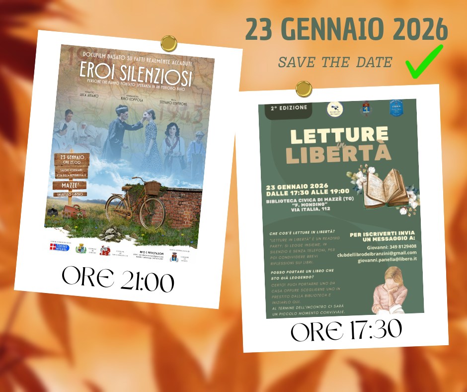 Sarà venerdì 23 gennaio 2026 una data da segnare in agenda per Mazzè, che si prepara ad accogliere una giornata speciale all’insegna della cultura, della memoria e dell’incontro. Un “save the date” che racchiude due appuntamenti distinti ma complementari, pensati per coinvolgere pubblici diversi e uniti dal filo conduttore della condivisione e del racconto.
