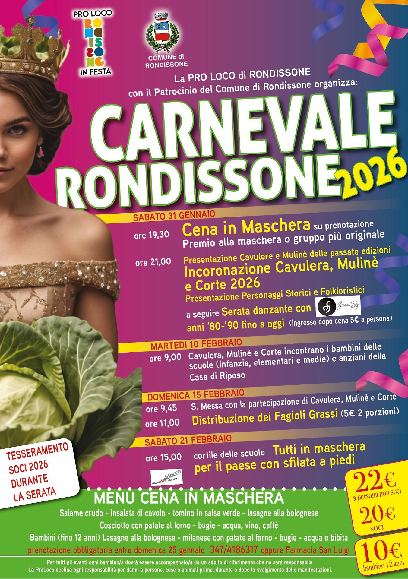 L’apertura è fissata per sabato 31 gennaio 2026, con uno dei momenti più attesi: la Cena in Maschera. Alle ore 19.30 si aprono le porte per una serata che prevede anche il premio alla maschera o al gruppo più originale. Il menu propone salame crudo, insalata di cavolo, tomino in salsa verde, lasagne alla bolognese, cosciotto con patate al forno, bugie, accompagnati da acqua, vino e caffè. Per i bambini fino a 12 anni sono previsti lasagne alla bolognese, milanese con patate al forno, bugie e acqua o bibita. La prenotazione è obbligatoria entro domenica 25 gennaio, contattando il 347/4186317 oppure la Farmacia San Luigi. Durante la serata sarà possibile effettuare anche il tesseramento soci 2026.