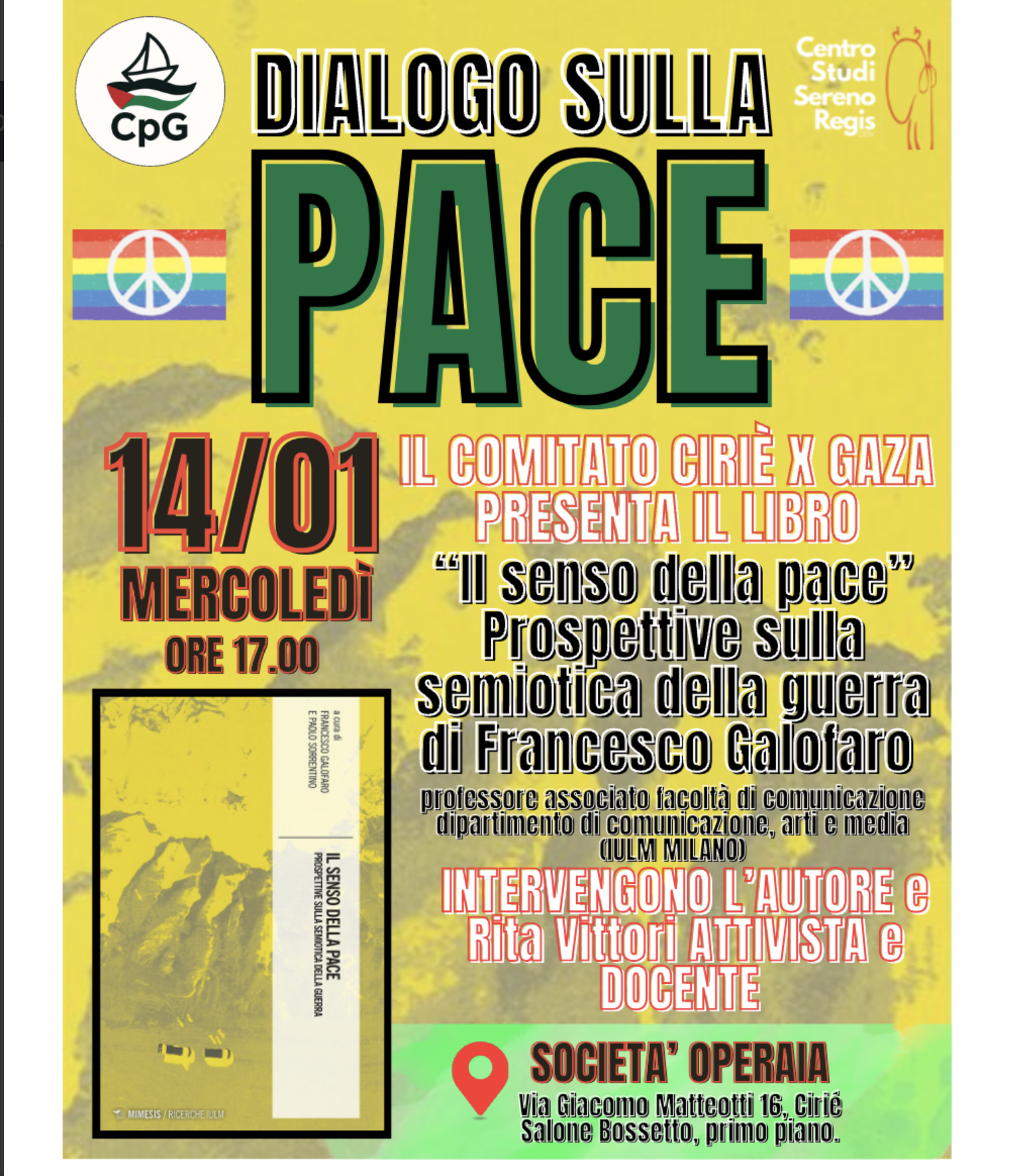 Il primo momento in ordine cronologico è fissato per mercoledì 14 gennaio alle 17, negli spazi della Società Operaia di via Giacomo Matteotti 16, al Salone Bossetto. Qui il Comitato Ciriè X Gaza propone un dialogo sulla pace a partire dal libro “Il senso della pace. Prospettive sulla semiotica della guerra” di Francesco Galofaro, professore associato alla Facoltà di Comunicazione dell’IULM di Milano. Un incontro che si annuncia denso di contenuti, pensato per analizzare il linguaggio della guerra, i suoi simboli e le sue narrazioni, andando oltre la cronaca per interrogarsi su come i conflitti vengono raccontati e compresi. Accanto all’autore interviene Rita Vittori, attivista e docente, contribuendo a un confronto che mette insieme analisi accademica e impegno civile. L’iniziativa si inserisce in un percorso più ampio di sensibilizzazione promosso dal Comitato, con il supporto del Centro Studi Sereno Regis, e punta a offrire strumenti critici in un contesto internazionale segnato da tensioni e violenze persistenti.