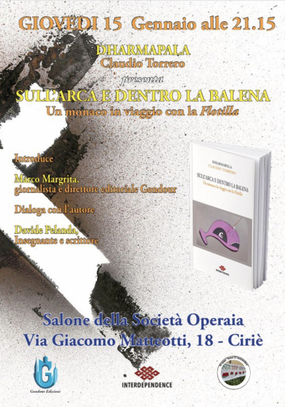 Il secondo appuntamento arriva il giorno successivo, giovedì 15 gennaio alle 21.15, e si sposta nel Salone della Società Operaia di via Giacomo Matteotti 18. Protagonista della serata è Claudio Tornero, noto come Dharmapala, che presenta il libro “Sull’arca e dentro la balena. Un monaco in viaggio con la Flottilla”. Un racconto che nasce dall’esperienza diretta, dal viaggio e dall’incontro, e che si muove sul confine tra testimonianza personale, riflessione spirituale e osservazione politica. A introdurre l’incontro è Marco Margrita, giornalista e direttore editoriale di Gandora, mentre il dialogo con l’autore è affidato a Davide Peraldo, insegnante e scrittore. La serata, sostenuta da Gandora Edizioni, Interdependence e dalla stessa Società Operaia, propone uno sguardo diverso sul Mediterraneo, sulle missioni civili e sulla dimensione umana dei conflitti, attraverso la lente di un percorso interiore che si intreccia con la realtà geopolitica.
