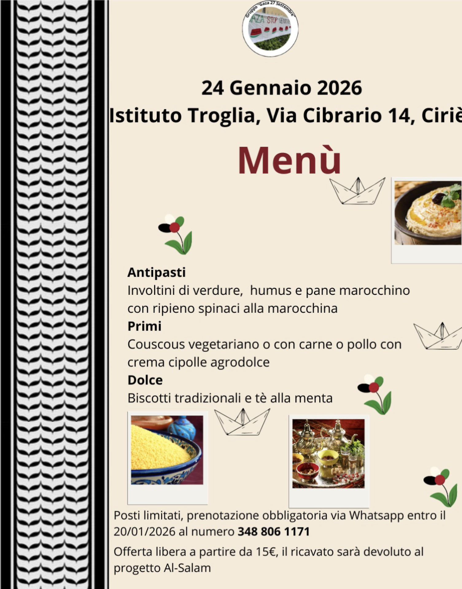 Il ciclo si chiude sabato 24 gennaio 2026 con un evento di natura diversa ma complementare, che traduce la riflessione in gesto concreto di solidarietà. Presso l’Istituto Troglia di via Cibrario 14, a Ciriè, è in programma una cena solidale il cui ricavato sarà devoluto al progetto Al-Salam. Il menù richiama la tradizione gastronomica nordafricana e mediorientale, con antipasti a base di involtini di verdure, hummus e pane marocchino, seguiti da couscous vegetariano o con carne o pollo accompagnato da crema di cipolle agrodolce, e conclusi da biscotti tradizionali e tè alla menta. L’offerta è libera a partire da 15 euro, ma i posti sono limitati e la prenotazione è obbligatoria entro il 20 gennaio, tramite WhatsApp. Una serata pensata non solo come momento conviviale, ma come occasione per sostenere un progetto che lavora sul dialogo e sulla pace, dando continuità ai temi affrontati nei giorni precedenti.