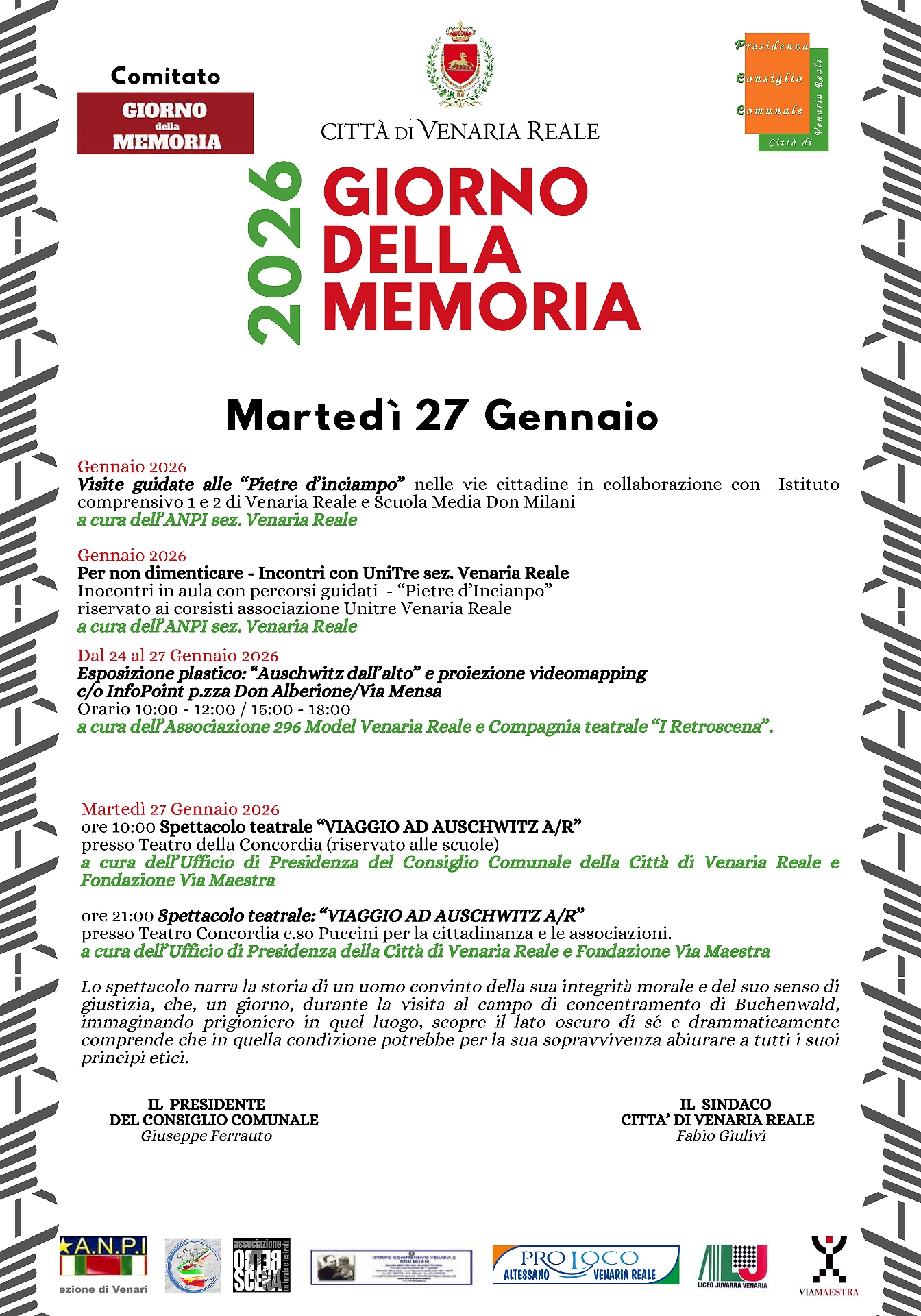Il 27 gennaio 2026, giorno della ricorrenza ufficiale, è dedicato al teatro come strumento di riflessione profonda. Alle ore 10:00, presso il Teatro della Concordia, va in scena lo spettacolo “Viaggio ad Auschwitz A/R”, riservato alle scuole. La sera, alle ore 21:00, lo stesso spettacolo torna sul palco del teatro di corso Puccini, aperto alla cittadinanza e alle associazioni. L’iniziativa è curata dall’Ufficio di Presidenza della Città di Venaria Reale e dalla Fondazione Via Maestra.