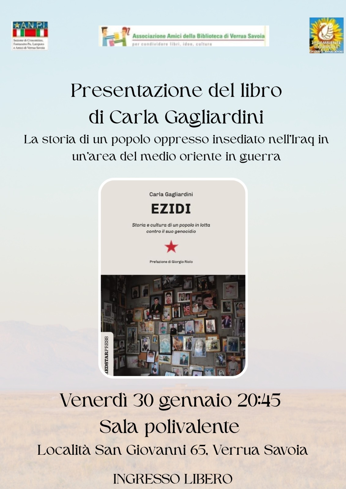 Al centro della serata la presentazione del libro “EZIDI. Un popolo in lotta contro il suo genocidio”, firmato da Carla Gagliardini, un lavoro che ricostruisce storia, cultura e persecuzioni della comunità ezida, insediata in Iraq in un’area del Medio Oriente devastata dalla guerra. Un racconto che unisce ricerca, testimonianza e memoria, con la prefazione di Giorgio Riolo, e che restituisce voce a chi è stato ridotto al silenzio.