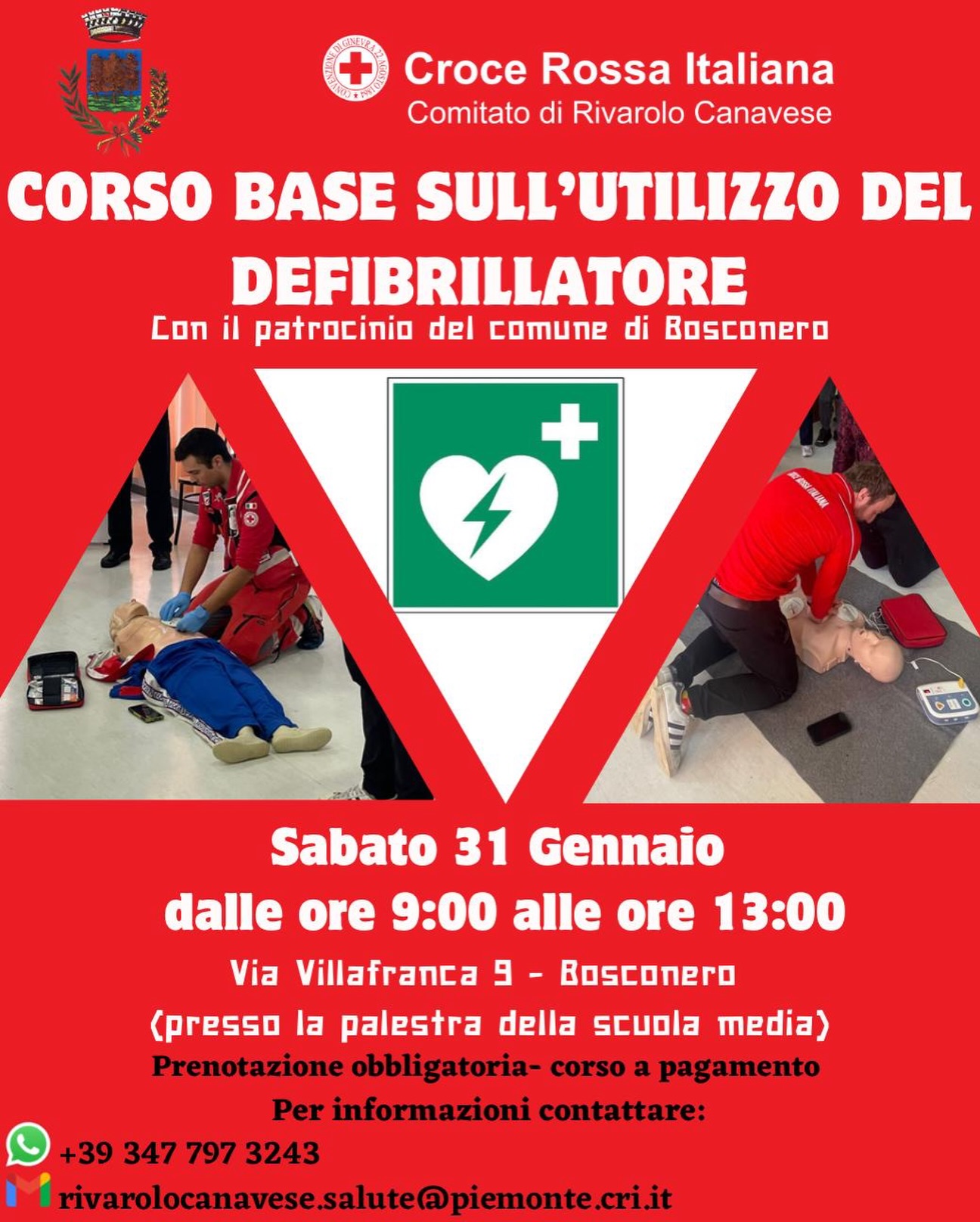 Sapere cosa fare nei primi minuti può fare la differenza tra la vita e la morte. È da questa consapevolezza che nasce il corso base sull’utilizzo del defibrillatore organizzato dalla Croce Rossa Italiana – Comitato di Rivarolo Canavese, in programma sabato 31 gennaio 2026, dalle 9.00 alle 13.00, presso la palestra della scuola media di via Villafranca 9, con il patrocinio del Comune di Bosconero.